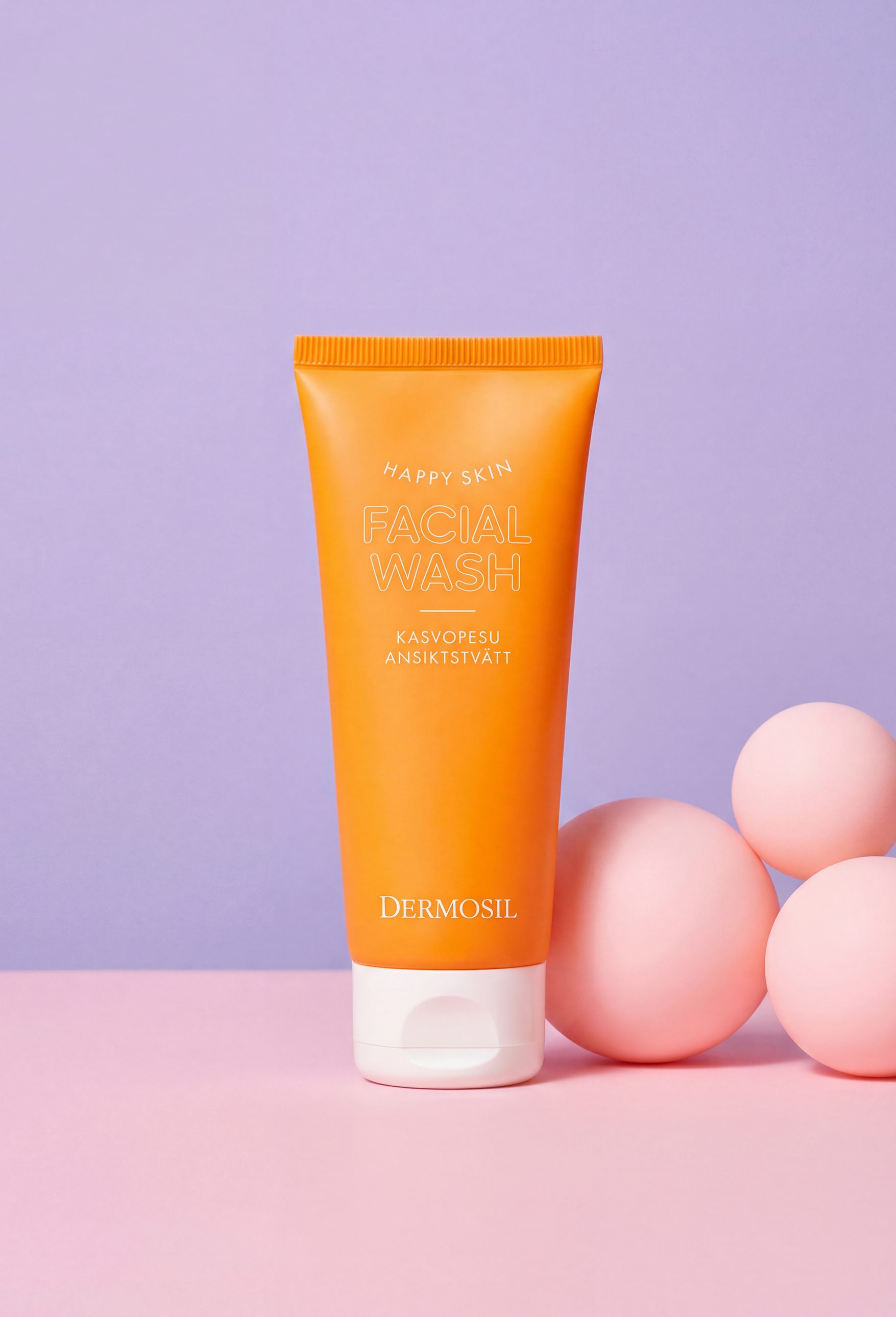 Happy Skin Ansiktstvätt avlägsnar orenheter och makeup. Mild doft av vattenmelon och röda bär. Produkten passar för olika hudtyper och har en aningen gelaktig sammansättning som är smidig att använda.