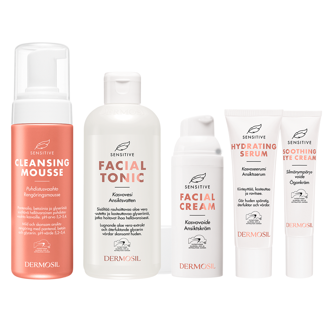 Hudvård för extra känslig hud! Våra skonsamma Sensitive-produkter är allergimärkta och parfymfria och passar även mycket torr eller atopisk hud. En bra bas i hudvårdsrutinen som tryggt kan användas av hela familjen, också spädbarn.
