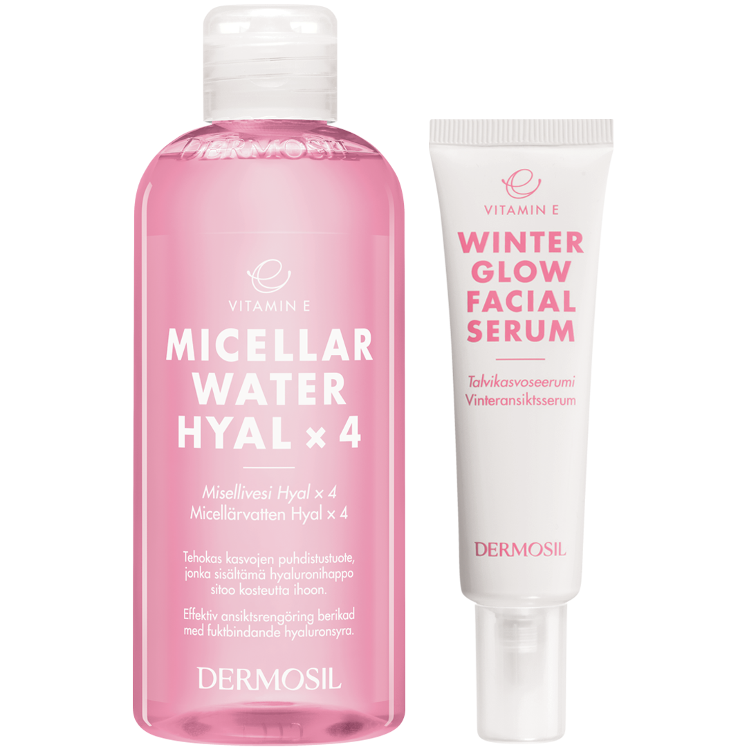 Vitamin E micellärvatten och ansiktssetum-setet innehåller två fuktgivande produkter för ansiktet.