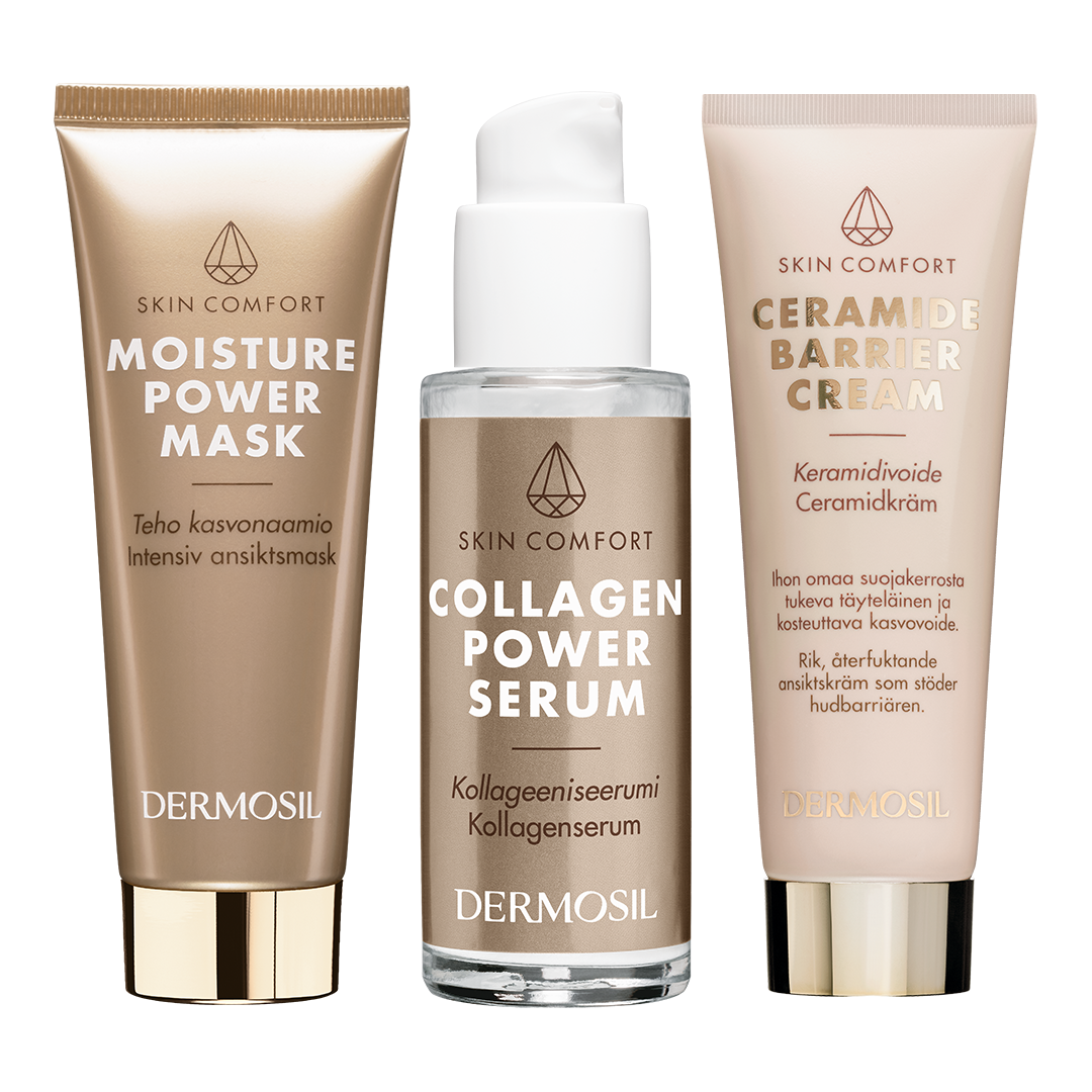 Skin Comfort Power set innehåller tre produkter som effektivt återfuktar och stärker mogen hud: Intensiv ansiktsmask, Kollagenserum samt Ceramidkräm. Dessa tre produkter återfuktar huden intensivt samtidigt som de stärker den. När huden åldras blir den torrare och förlorar sin elasticitet, vilket gör att hudvårdsprodukterna behöver vara extra effektiva. Mogen hud kräver därför produkter med särskilda egenskaper och kraftfulla aktiva ingredienser som stöder huden på flera sätt.