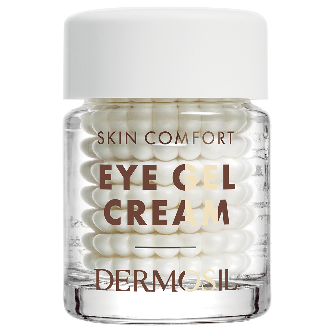 Dermosil Skin Comfort Ögongelkräm vårdar den känsliga huden runt ögonen. Produkten kommer i en glasburk i form av gelépärlor som förvandlas till silkeslen och slät gel när du rör vid dem.