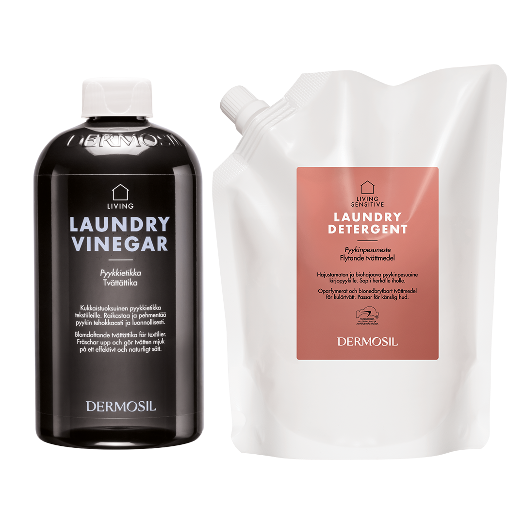 Living Tvättsetet för kläder gör din tvätt ren och mjuk! Setet innehåller inhemsk Tvättättika och det mild Sensitive Tvättmedlet.