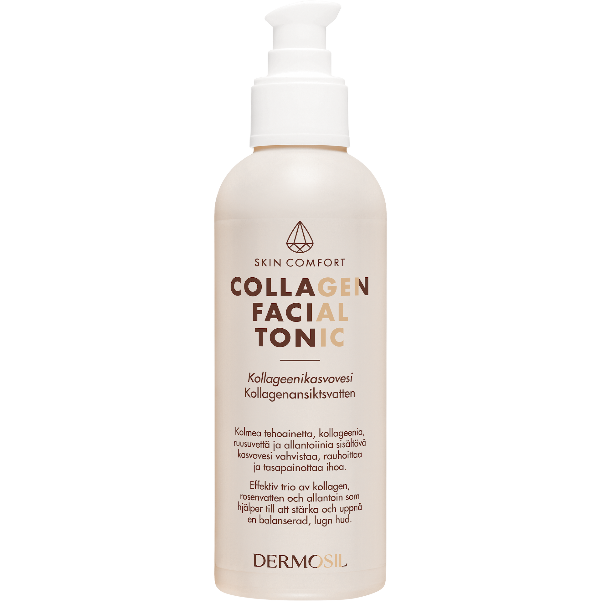 Kollagenansiktsvatten är ett fuktgivande och vårdande ansiktsvatten som sköter om stramande och torr hy efter rengöring. Det lyxiga, alkoholfria ansiktsvattnet innehåller rikligt med fuktgivande och näringsgivande ingredienser och har utvecklats särskilt för torr och mogen hy.