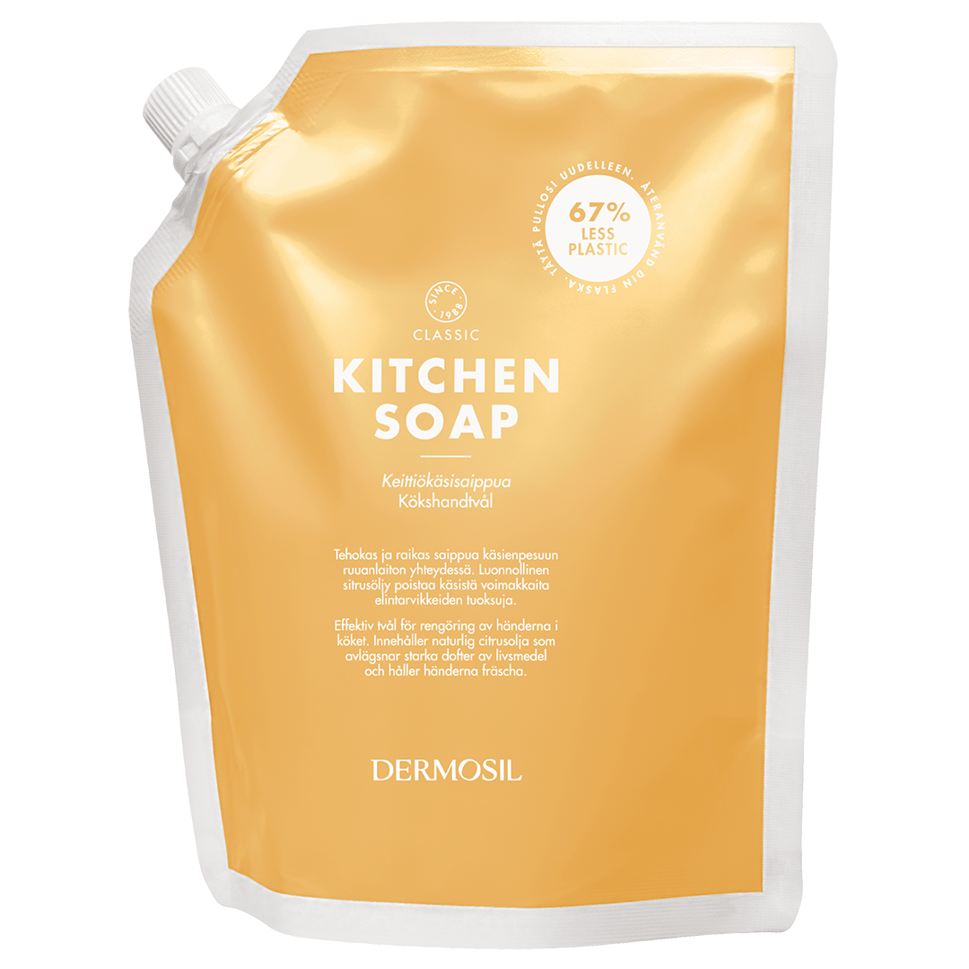 Dermosil Kökshandtvål rengör händerna effektivt i samband med matlagning. Innehåller naturliga citrusoljor som ger en frisk doft.