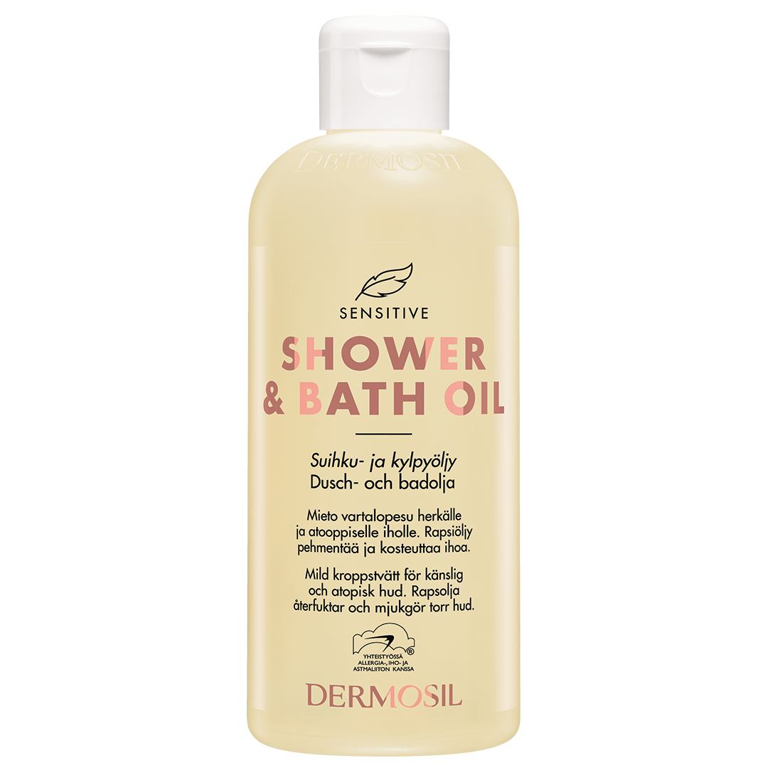 Sensitive Dusch- och badolja är speciellt utvecklad för daglig tvätt av torr och känslig hud samt atopisk hud.