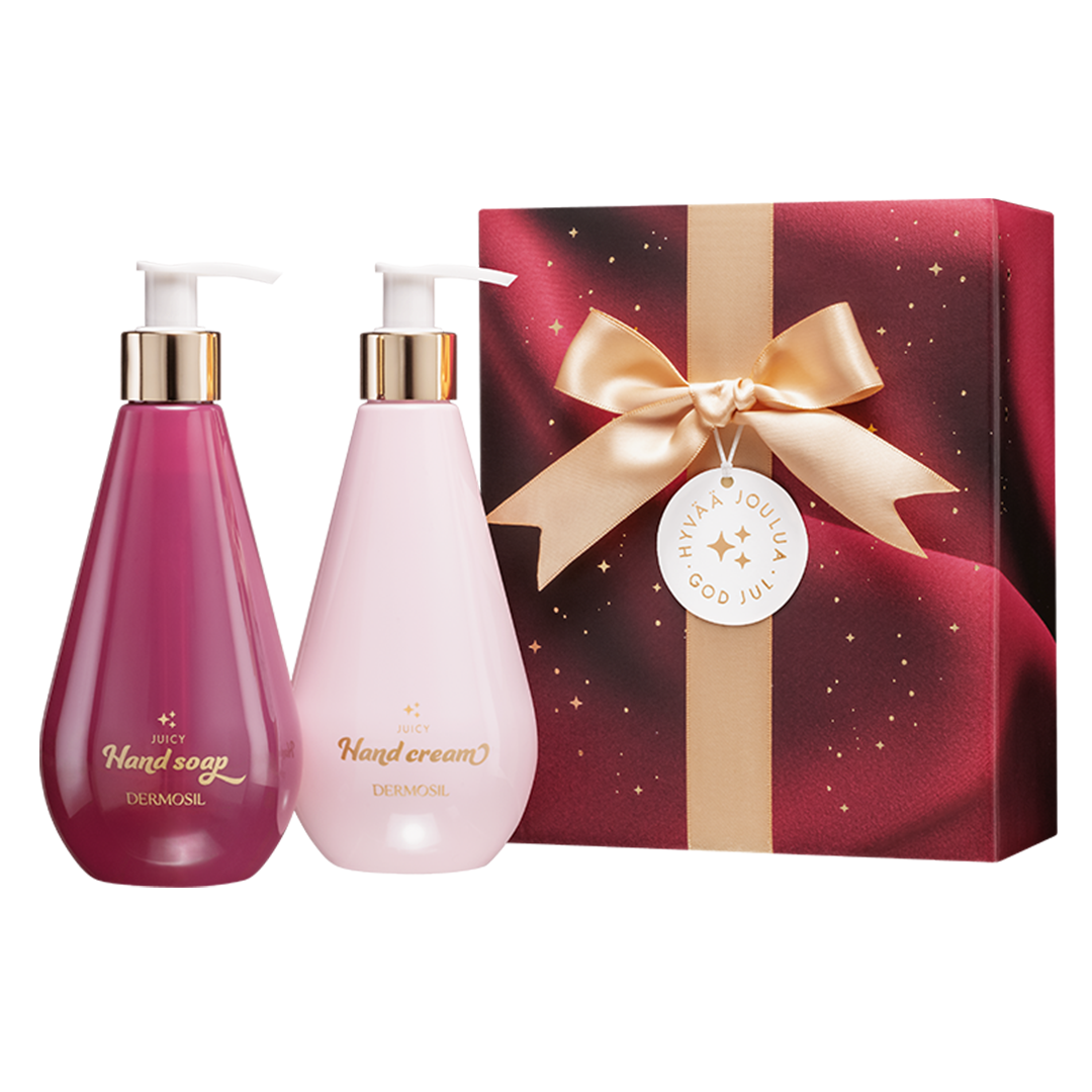 Julsetet Juicy består av en lyxig handtvål och handkräm som sköter om vintertorr hud på bästa sätt. Produkterna innehåller äkta hallon- och krusbärsextrakt som mjukgör huden och sköter om hudens välbefinnande. Tvålen innehåller dessutom fuktgivande glycerin och betain, och handkrämen innehåller mjukgörande och fuktgivande rypsolja samt skvalen – här har du alltså ett komplett set med fukt och mjukhet för händerna!