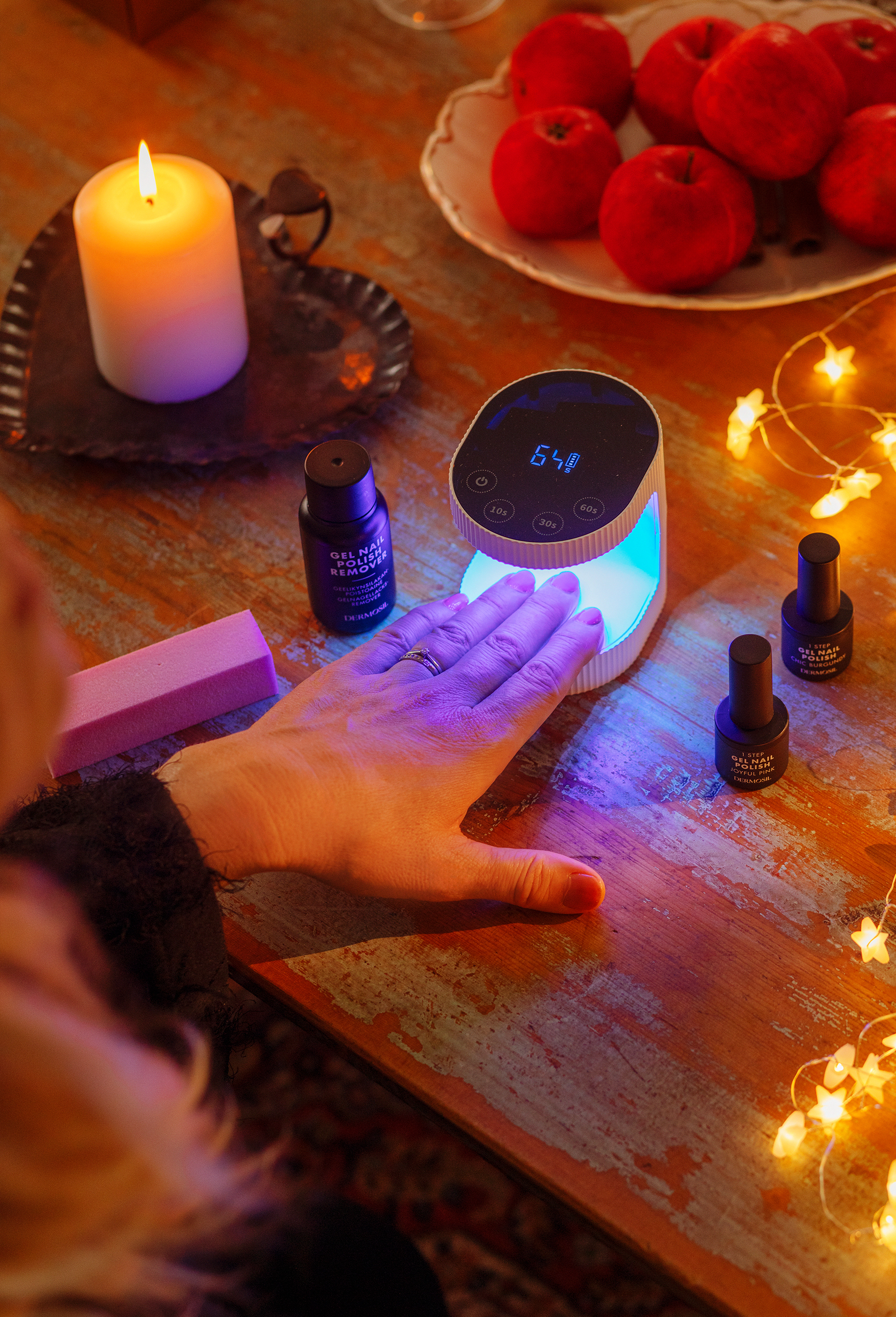 Julförpackningen Joyful & Chic innehåller allt du behöver för att göra en hållbar och vacker gelmanikyr hemma! I förpackningen finns en nagellampa, nagelfil, två gelnagellack samt gelnagellacksremover.