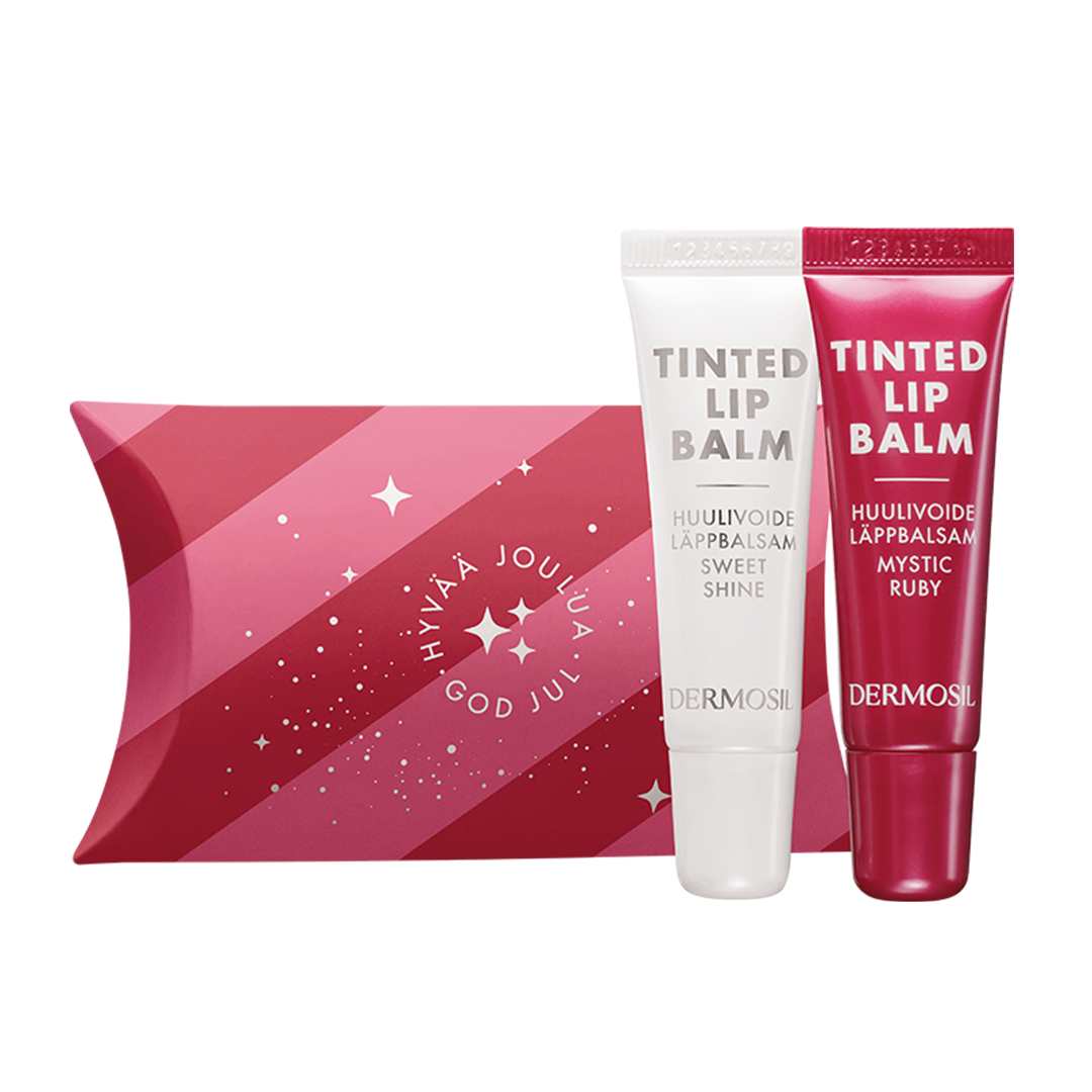 Julförpackningen Sweet & Mystic innehåller två vårdande läppbalsam i olika nyanser.