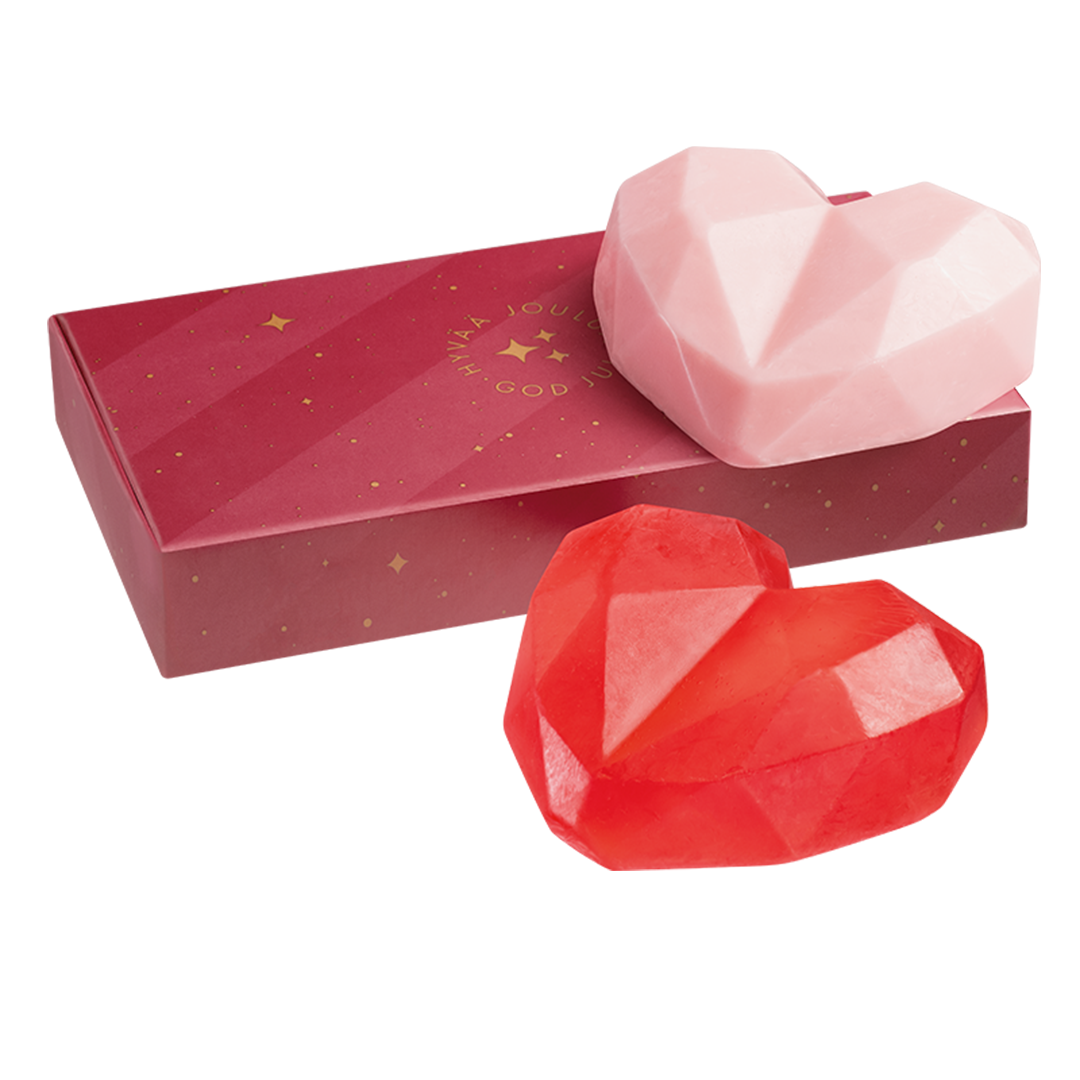 Två veganska tvålbitar i hjärtform som ger värme och mjukhet vid handtvätt. En förtjusande gåva till julens stund.