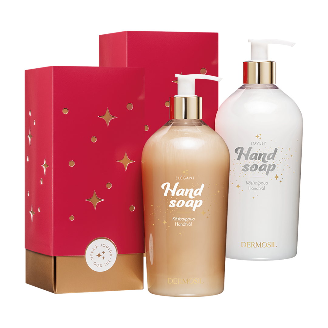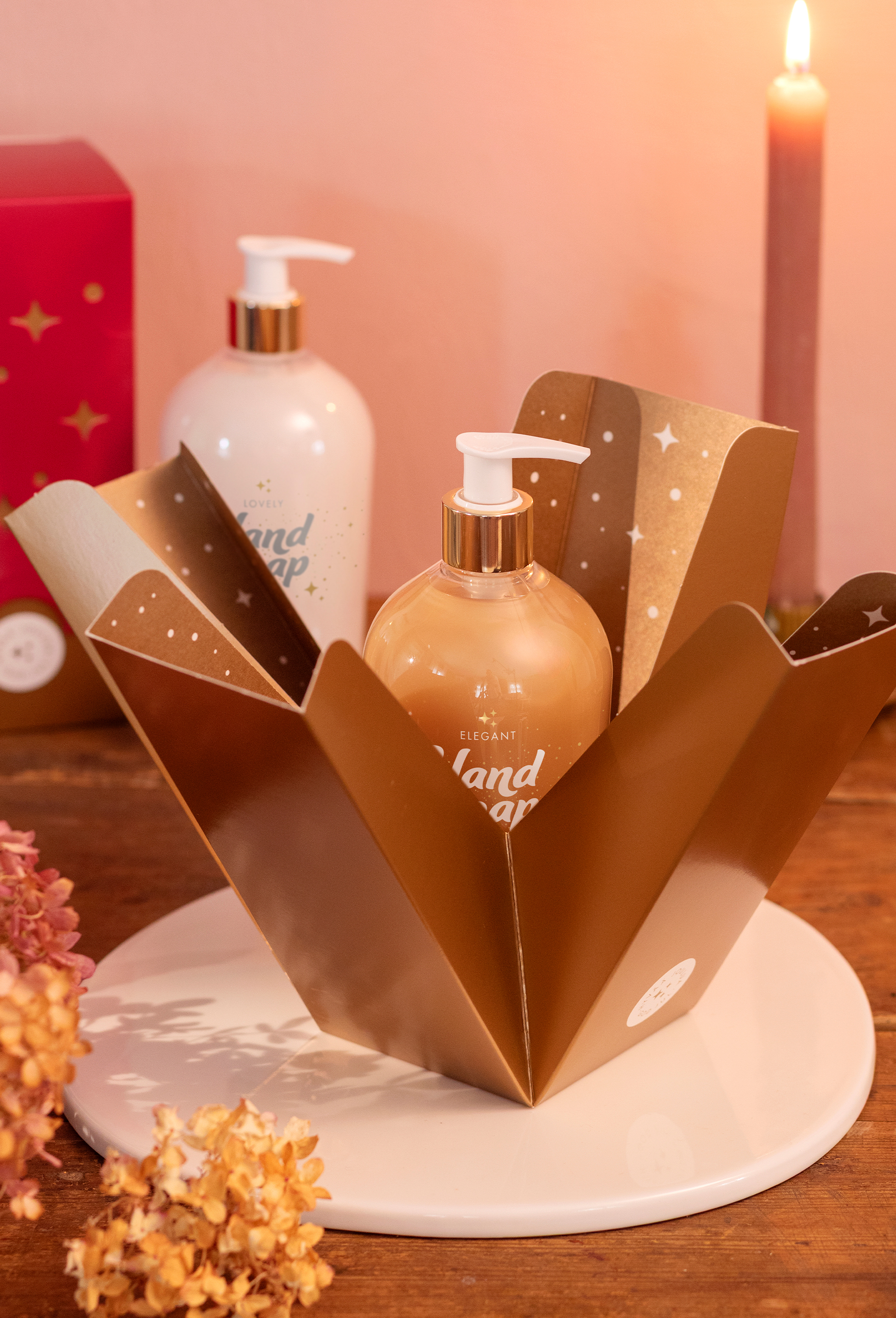 Vill du ha en fräsch Lovely Handtvål eller en kryddigt elegant Handtvål? Om du inte kan bestämma dig, välj Överraskningstvålen vars presentförpackning gömmer endera av julens underbara pärlemorskimrande handtvålar!