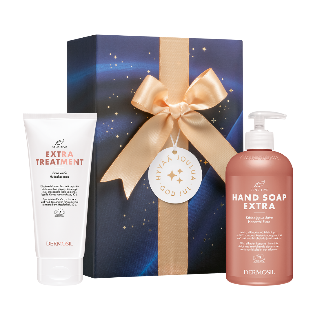 Julgåva Sensitive Extra är en alldeles underbar present till en mottagare som har känslig, torr eller atopisk hud. Våra älskade Extra-produkter, Sensitive Handtvål Extra och Sensitive Hudsalva Extra, är populära favoriter som hela familjen gillar.