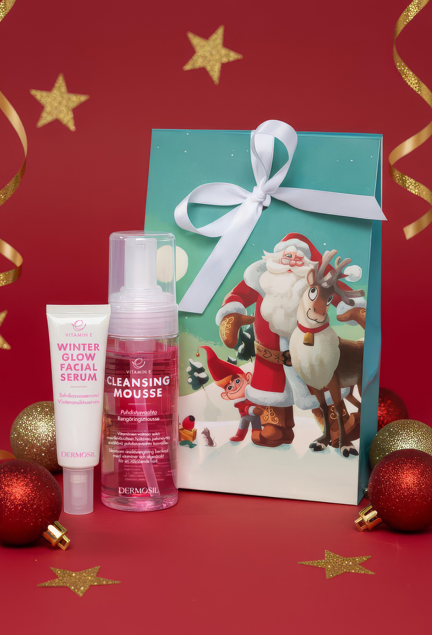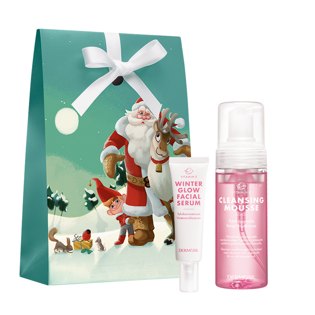 Julgåva Vitamin E innehåller Vitamin E Rengöringsmousse, vår mest omtyckta rengöringsprodukt genom tiderna, samt Vitamin E Vinteransiktsserum som tagits fram för vård av huden under den kalla årstiden.