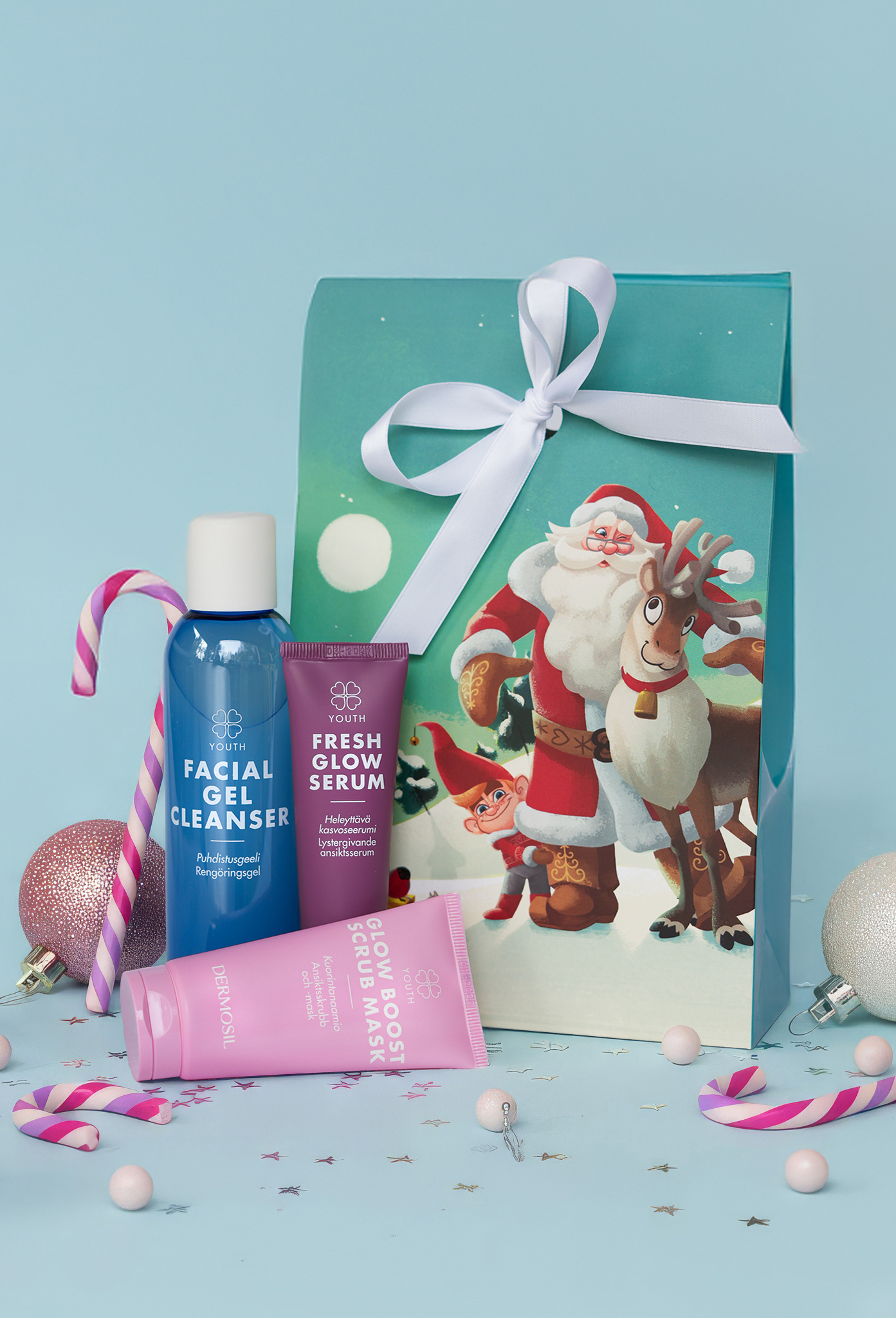 Julgåva Youth innehåller milda, men effektivt vårdande produkter, utvecklade speciellt för den unga hudens behov. Rengöringsgel, Ansiktsskrubb- och mask samt Lystergivande serum utgör tillsammans en härlig hudvårdsgåva – som även passar vuxen hud som behöver extra fräschör och glow!