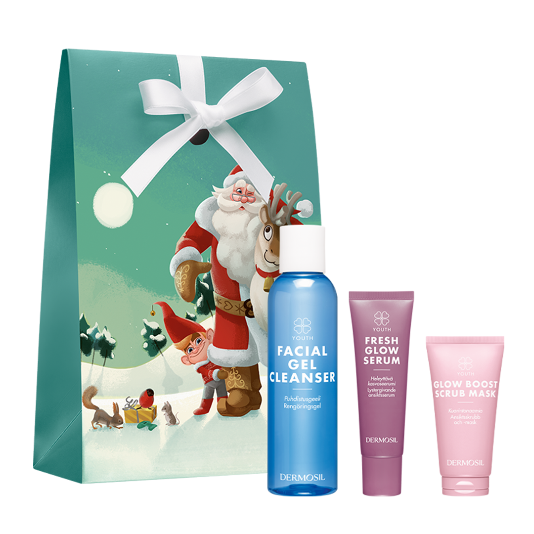 Julgåva Youth innehåller milda, men effektivt vårdande produkter, utvecklade speciellt för den unga hudens behov. Rengöringsgel, Ansiktsskrubb- och mask samt Lystergivande serum utgör tillsammans en härlig hudvårdsgåva – som även passar vuxen hud som behöver extra fräschör och glow!