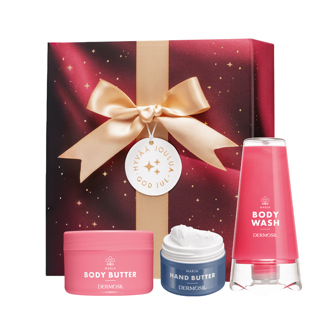 Julgåva Marja innehåller två av våra läckra hallonprodukter – Hallonduschgel och Kroppskräm Hallon – samt den härligt blåbäriga Blåbärshandkrämen. Produkternas innehåll av riktiga bärfröoljor gör denna hudvårdsgåva oemotståndligt härlig!