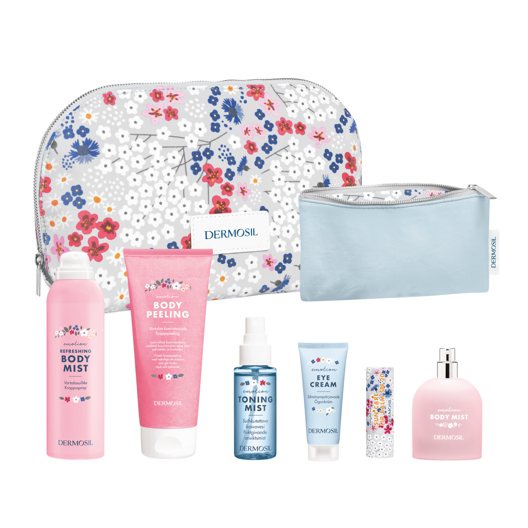 Dermosil Emotion Kroppspeeling är en mjuk och effektiv kroppspeeling med naturliga peelingkorn som lämnar huden slät och fräsch. Dermosil Emotion Kroppsspray är en lätt doftande kroppsspray som fräschar upp utan att kännas tung. Dermosil Emotion Kroppsmist används som en parfym, spraya på huden eller kläderna och låt torka. Doften är en blandning av fläder och rabarber med inslag av svartvinbär, viol och röda frukter.