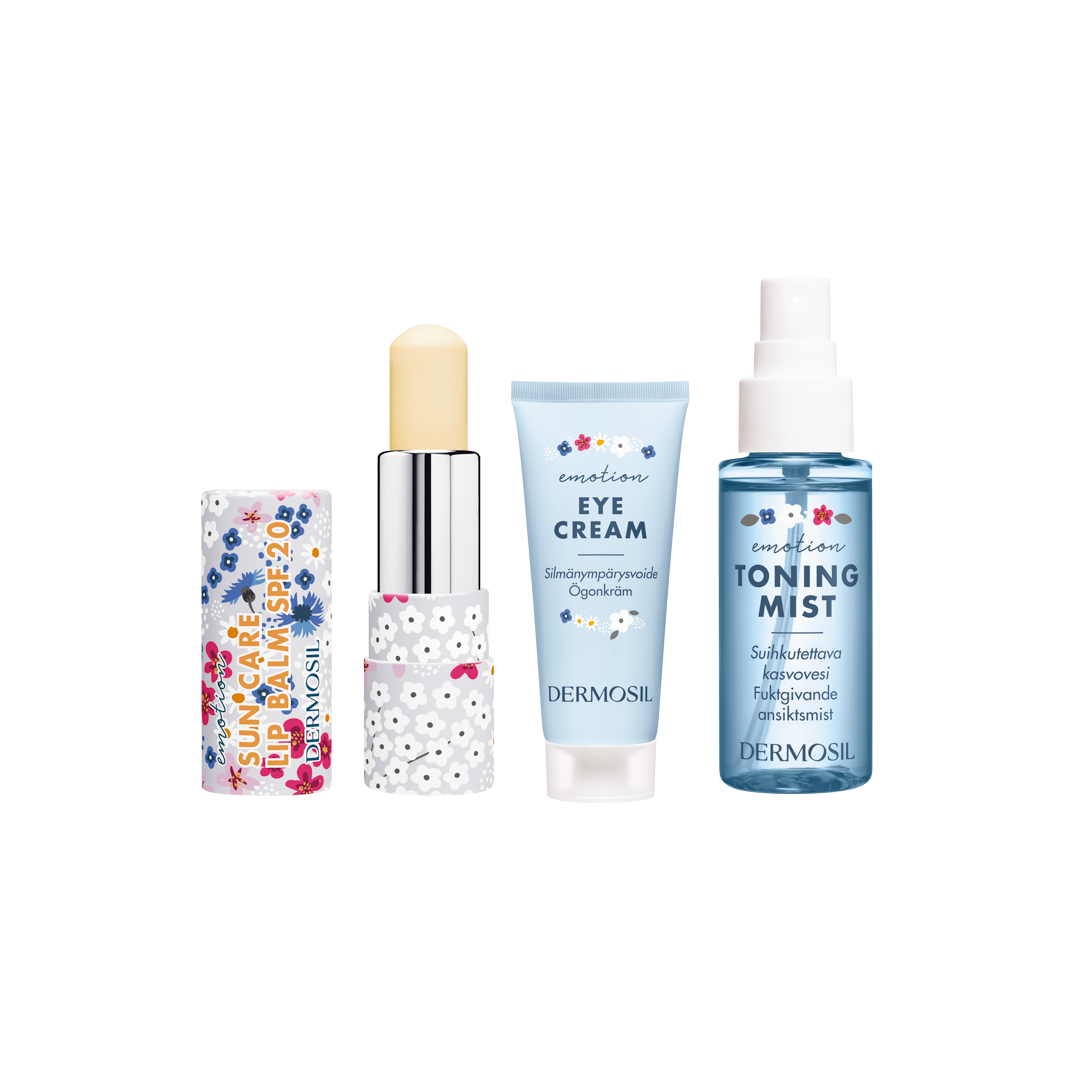 Dermosil Emotion-setet innehåller tre produkter som stöder hudens välmående i vardagen. De återfuktar, skyddar och piggar upp huden enkelt och bekvämt. Produkterna passar utmärkt i den dagliga hudvårdsrutinen.