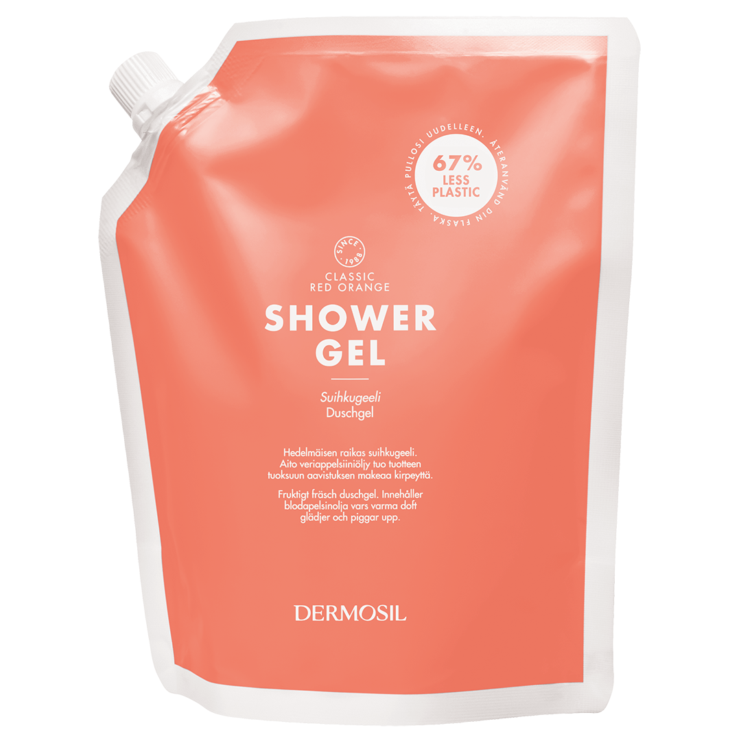 Dermosil Röd apelsin Duschgel har en mjuk gelkonsistens och ger ett rikligt lödder. Duschgelen tvättar huden skonsamt och gör den mjuk. Känns behaglig att applicera på huden, sköljs bort med ljummet vatten.
