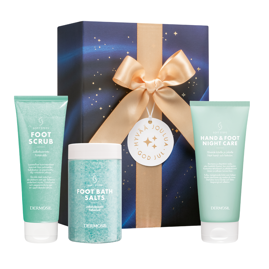 Julgåva Soft Steps innehåller tre av våra mest omtyckta fotvårdsprodukter: Fotbadsalt, Fotskrubb och Nattkräm för händer och fötter. Med dessa produkter kan du enkelt göra en effektiv och avkopplande fotbehandling hemma.
