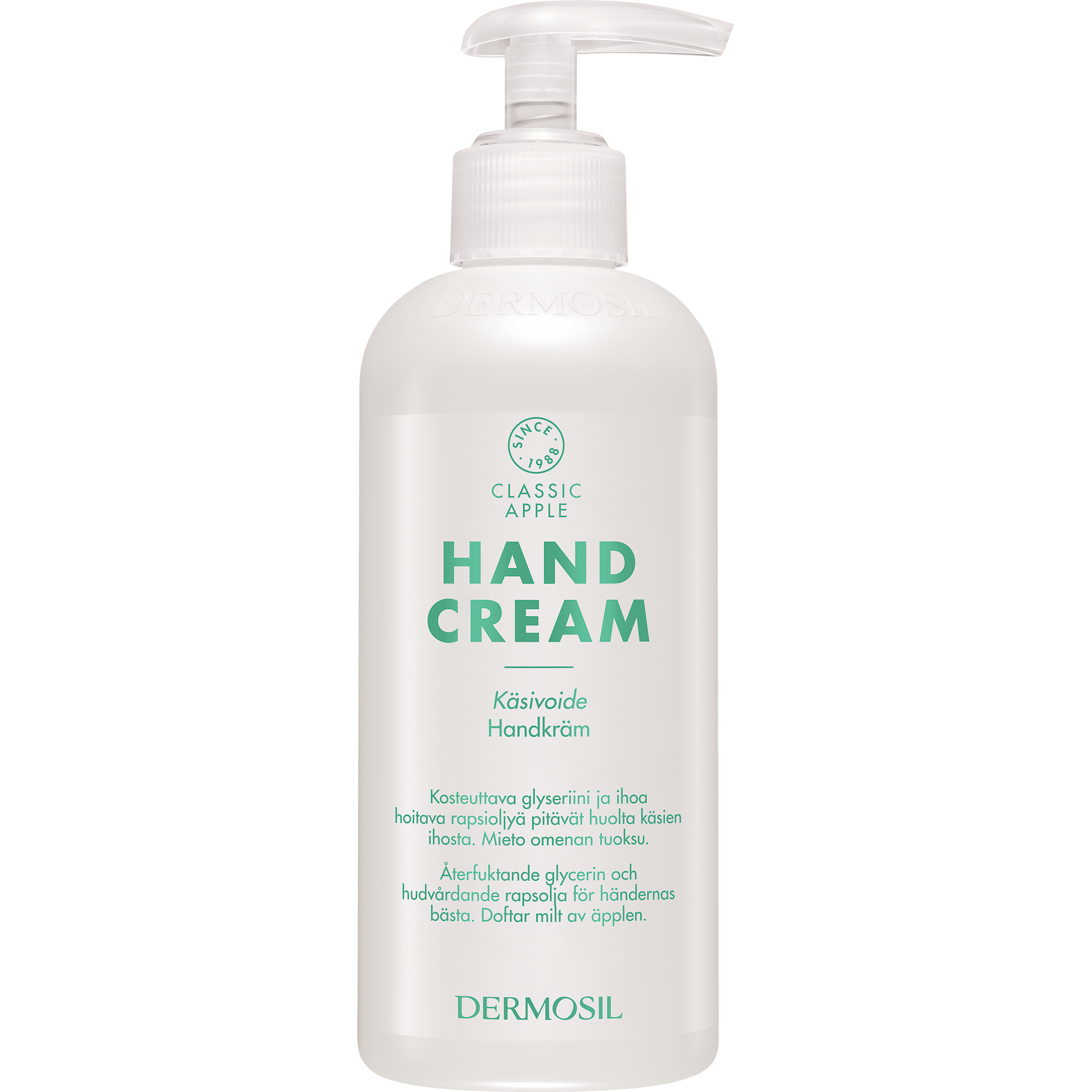 Dryg, fuktgivande och vårdande handkräm i pumpflaska för hela familjen. Handkrämen absorberas snabbt och får huden att kännas mjuk och återfuktad. Den friska doften består av grönt äpple toppat med stänk av päron och persika.