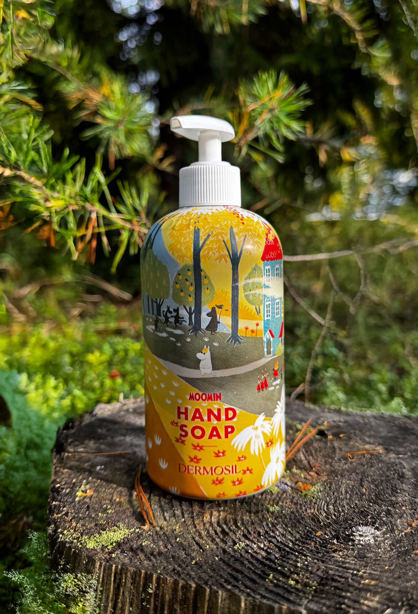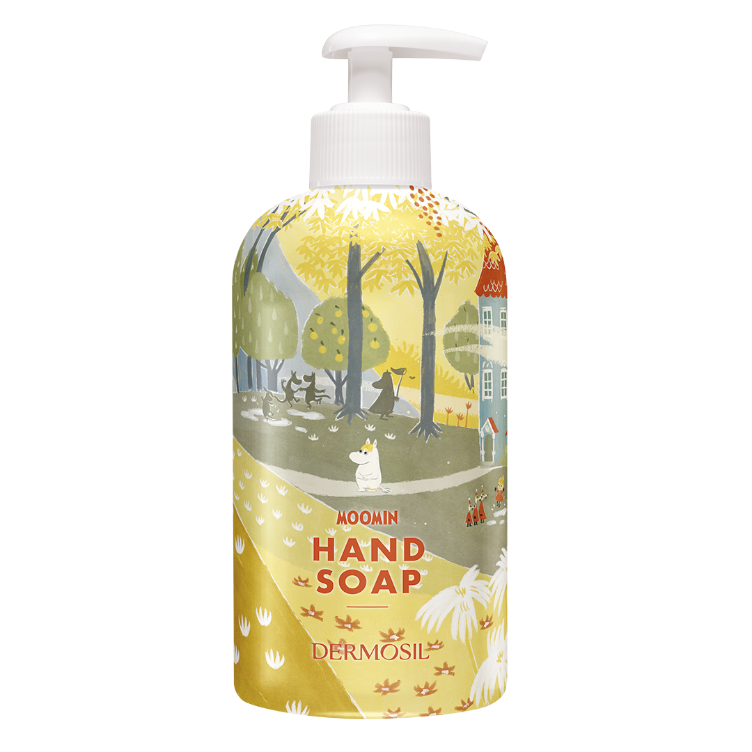 Mumin-handtvålen rengör händerna skonsamt medan den vårdar och skyddar huden. Tvålen innehåller björksav och betain, vilka vårdar huden. Tvålen innehåller också tallextrakt som har antioxidantiska egenskaper.