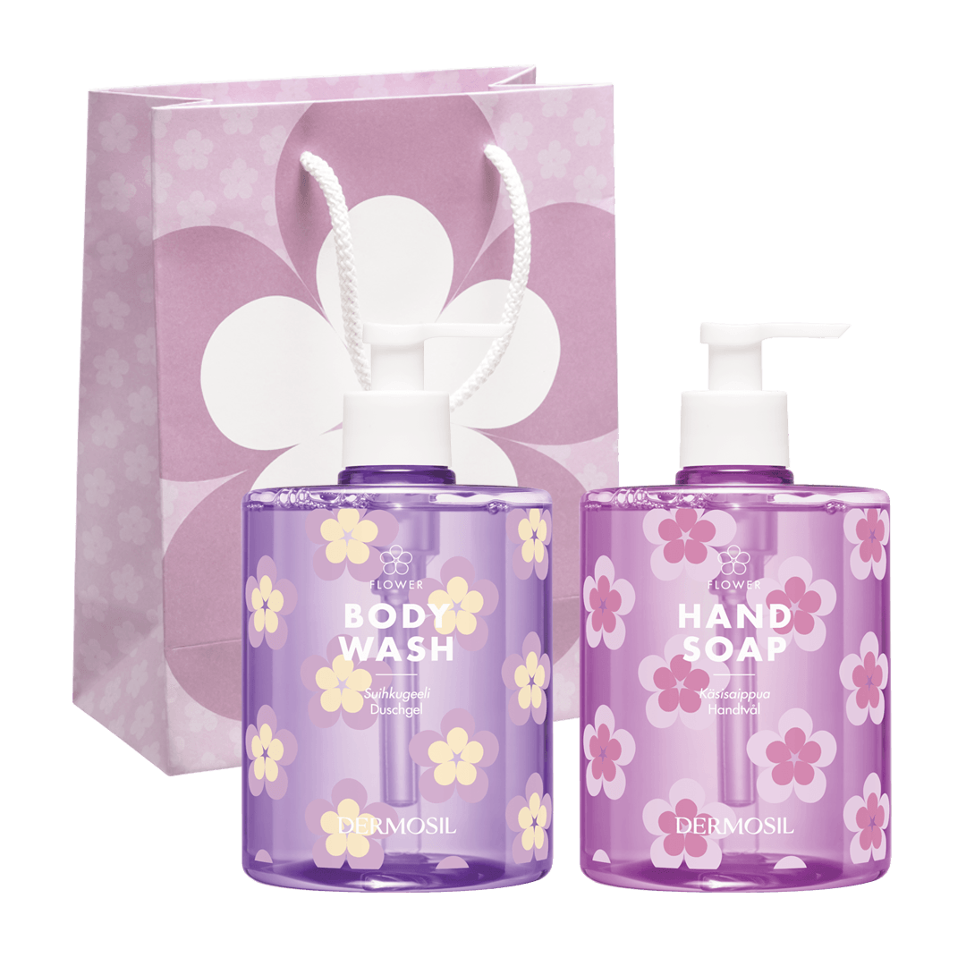 Flower Handtvål och Flower duschgel förtrollar med sitt charmiga blommönster och sin underbara doft! Flower tvålset är som en blomsterbukett som passar perfekt som gåva till sommarens fester.
