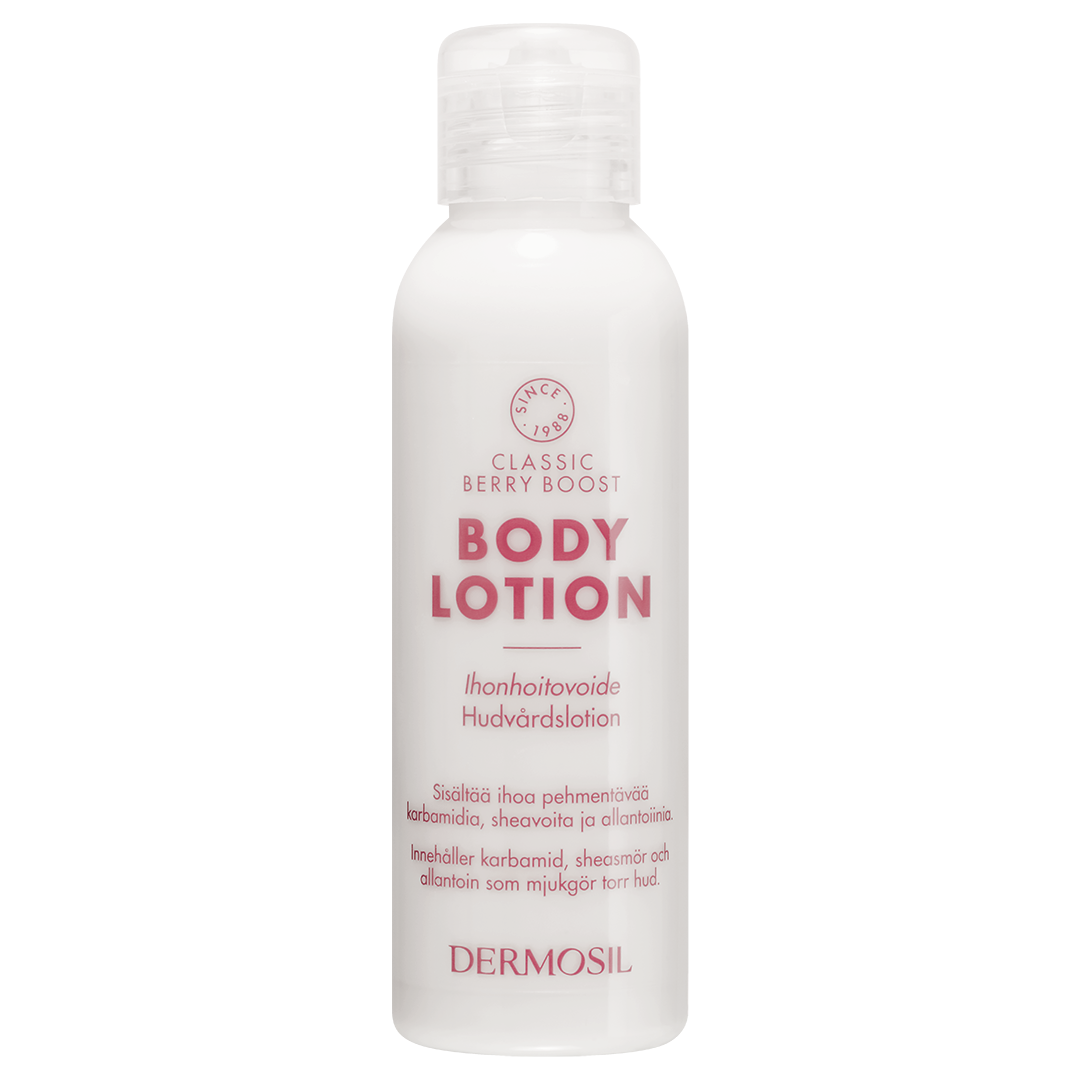 Berry Boost Hudvårdslotion är en lätt, fuktgivande kräm för kroppen. Krämen absorberas snabbt och lämpar sig för dagligt bruk. Den läckra doften är en krispig kombination av röda bär och fräscha frukter. Den praktiska förpackningen på 100 ml är smidig att ta med på resor, till träningen och andra aktiviteter.