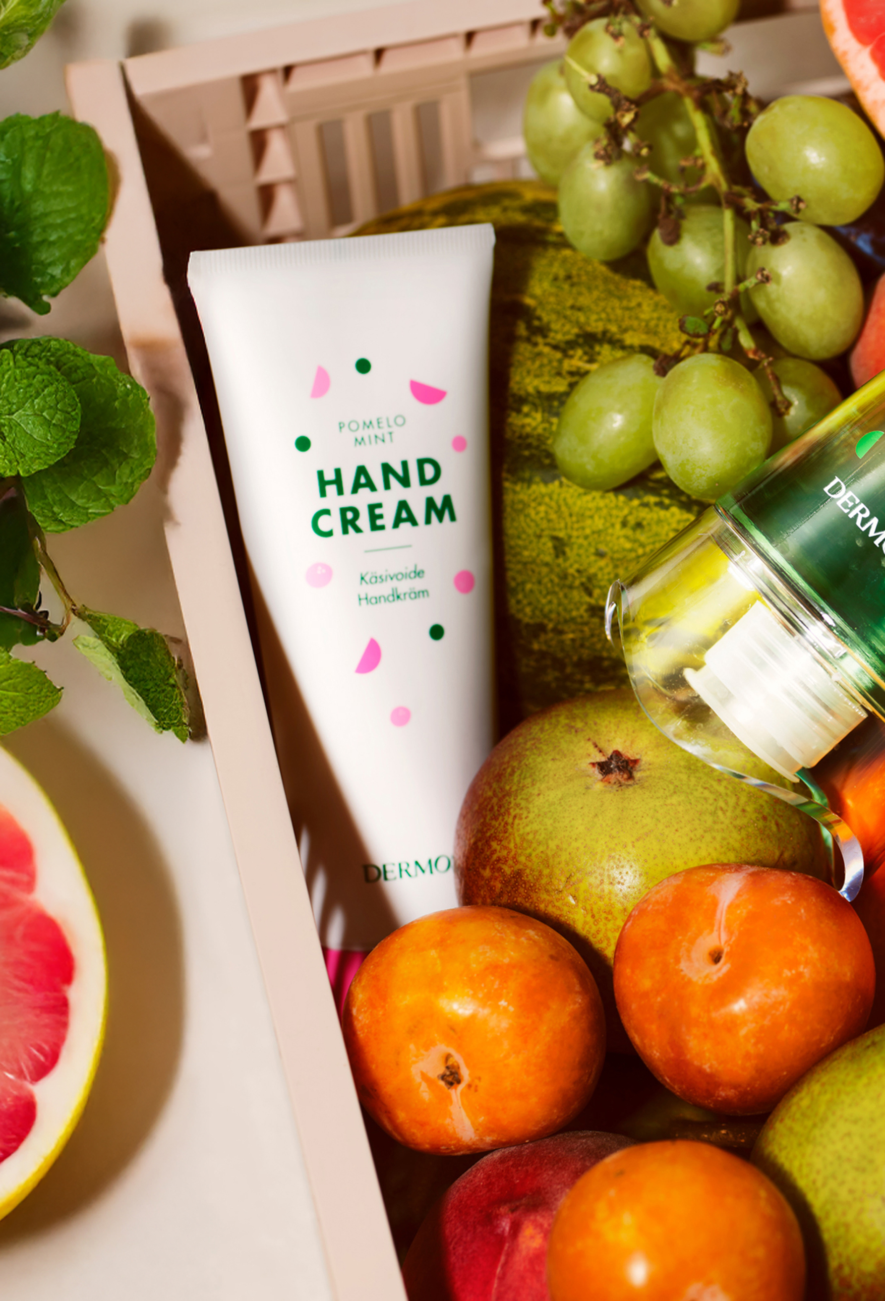 Den fuktgivande och vårdande handkrämen absorberas snabbt och får huden att kännas otroligt mjuk. Handkrämen innehåller pomeloextrakt och har en mild doft med insllag av aromatisk mint. Produkten är vegansk.