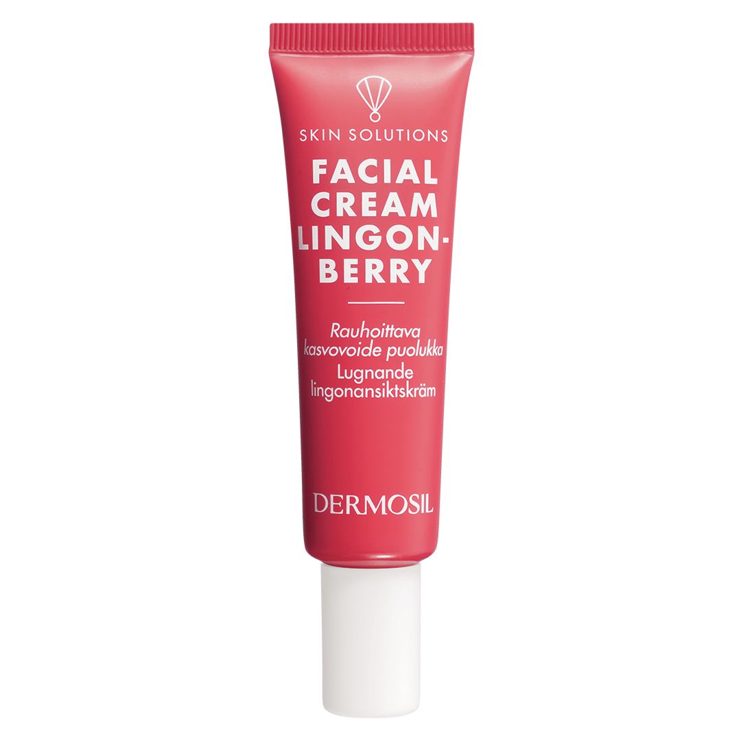 Dermosil Lugnande lingonansiktskräm skyddar och lugnar irriterad hud. Den återfuktande krämen passar alla hudtyper. Den stärker huden och bevarar dess elasticitet.