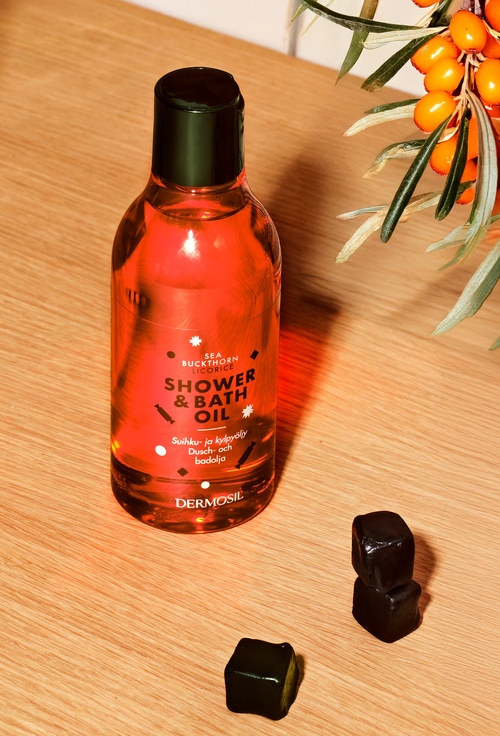 Dusch- och badoljan med doft av havtorn och lakrits gör huden underbart mjuk.