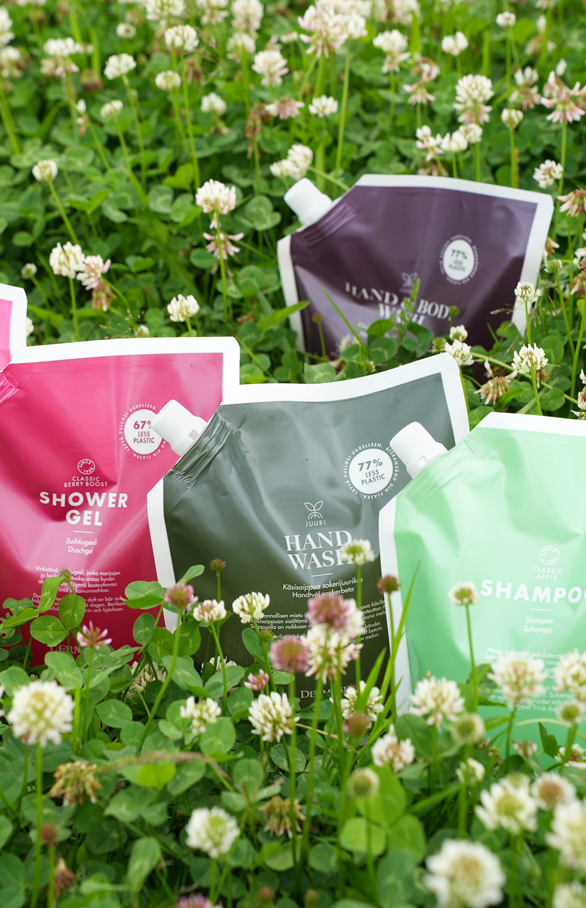 Refillpåsarnas material är PET/PA/PE-plast och korkens material är PP-plast. Den tomma påsen sorteras som plastavfall. Med refill sparar man en stor mängd plast och den tar mindre utrymme i sophinken.