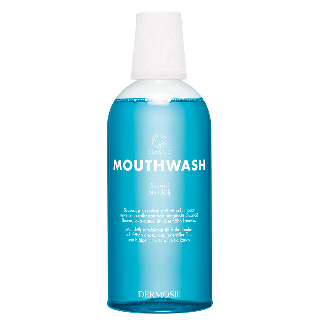 Fräscht mintsmakande Munskölj hjälper till att hålla tänderna friska och fräscha upp andedräkten. Munskölj innehåller fluor som hjälper till att förebygga karies.
