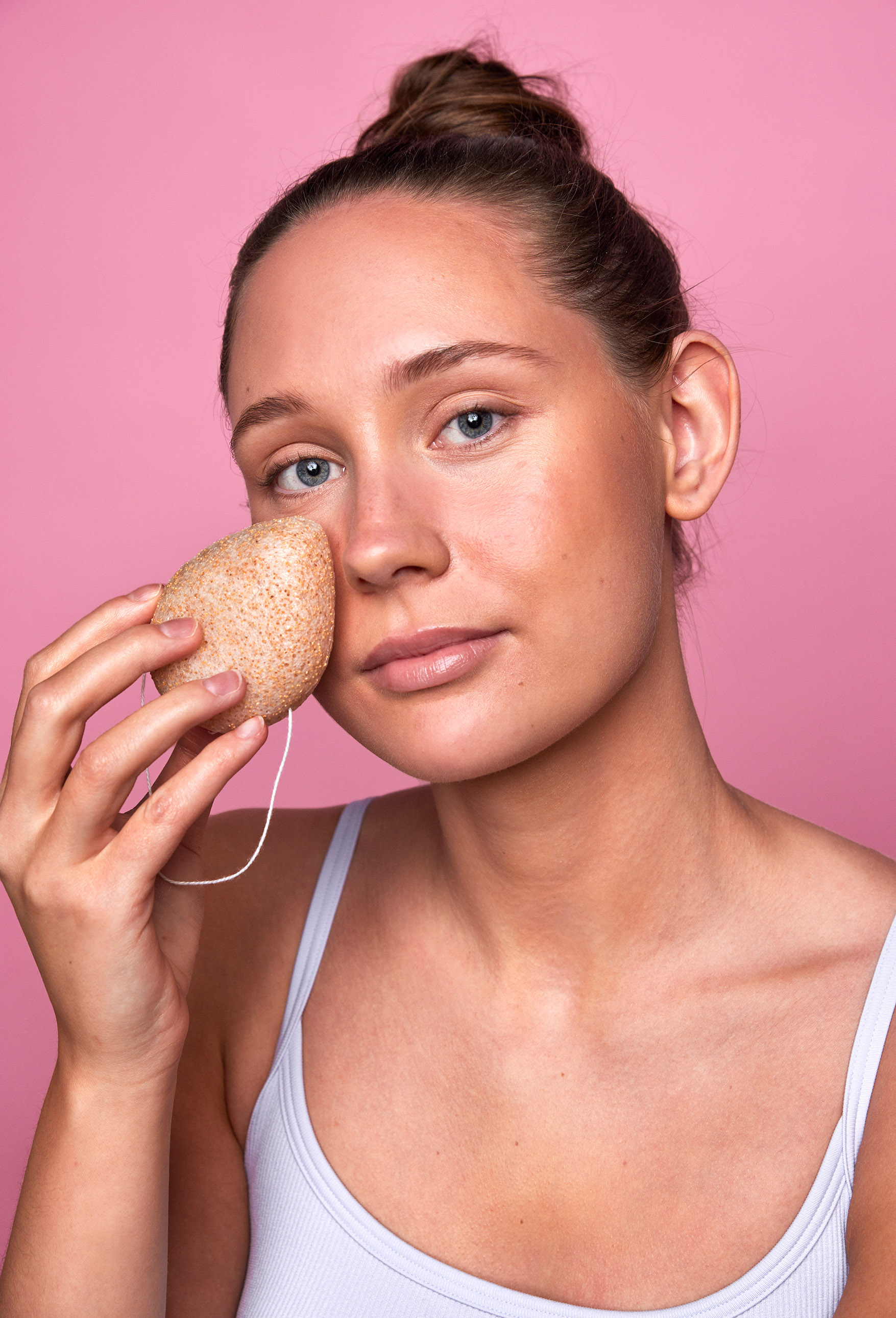 Konjac-svampen är stenhård då den är torr men i varmt vatten sväller den och mjuknar snabbt och vips är den användningsklar. Rengör huden med den fuktiga svampen genom att rulla runt svampen i ansiktet, vilket gör att hyn rengörs och döda hudceller avlägsnas skonsamt. Samtidigt stimuleras blodcirkulationen i ansiktet, trött hy blir piggare och cellbildningen aktiveras. Skölj till slut huden noggrant.