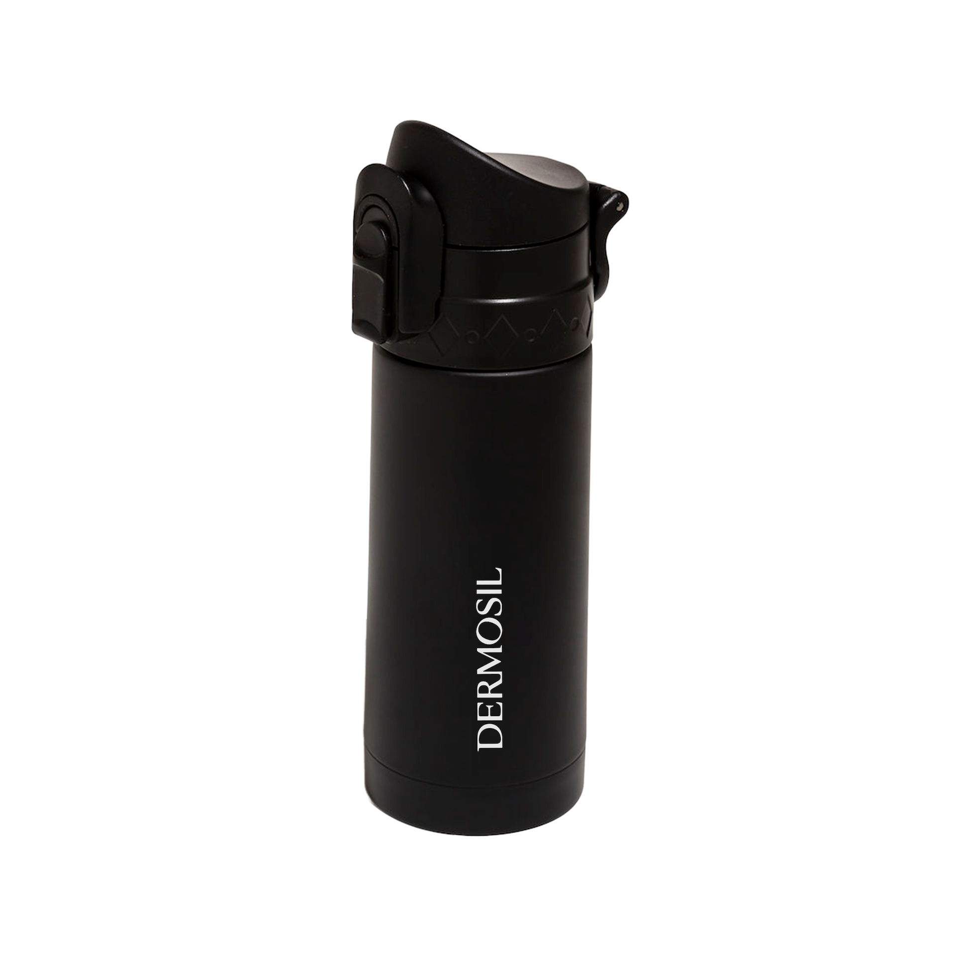 Dermosils termosmugg är smidig att ta med sig bråda morgnar eller på utflykter. Tack vare locket med låsningsmekanism hålls drycken varm länge.