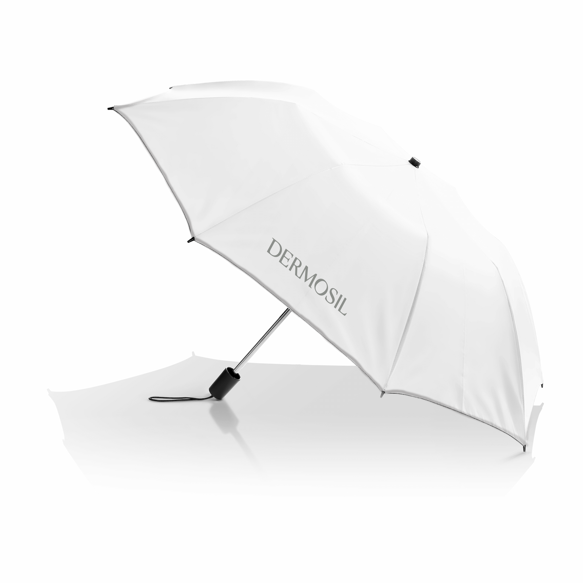 Dermosil paraplyet öppnas och stängs automatiskt. Paraplyet är tillverkat av starkt rPET-material och har reflekterande kantband och Dermosil-logo, för att du ska synas i mörker. Till ett paraply har gått åt 2,2 flaskor (0,5 liter). Storlek: 21".
