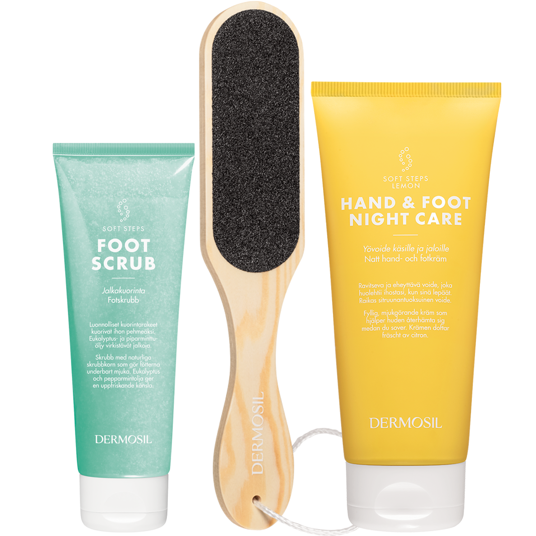 Setet Mjuka fötter innehåller tre lyxiga och effektiva produkter som ger dina fötter silkeslen och välmående hud.