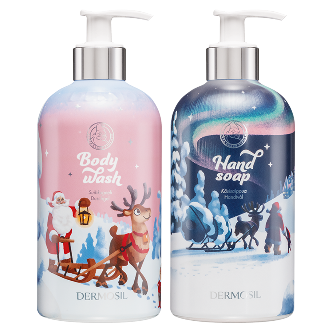 Jultomtens tvålduo innehåller Jultomtens officiella jultvålar till ett förmånligt setpris! Jultomtens Handtvål och Jultomtens Duschtvål har testats i Korvatunturis krävande förhållanden och bedömts vara extra snälla mot huden.