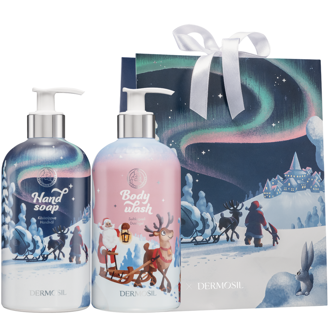 Jultomtens tvålduo innehåller Jultomtens officiella jultvålar till ett förmånligt setpris! Jultomtens Handtvål och Jultomtens Duschtvål har testats i Korvatunturis krävande förhållanden och bedömts vara extra snälla mot huden.