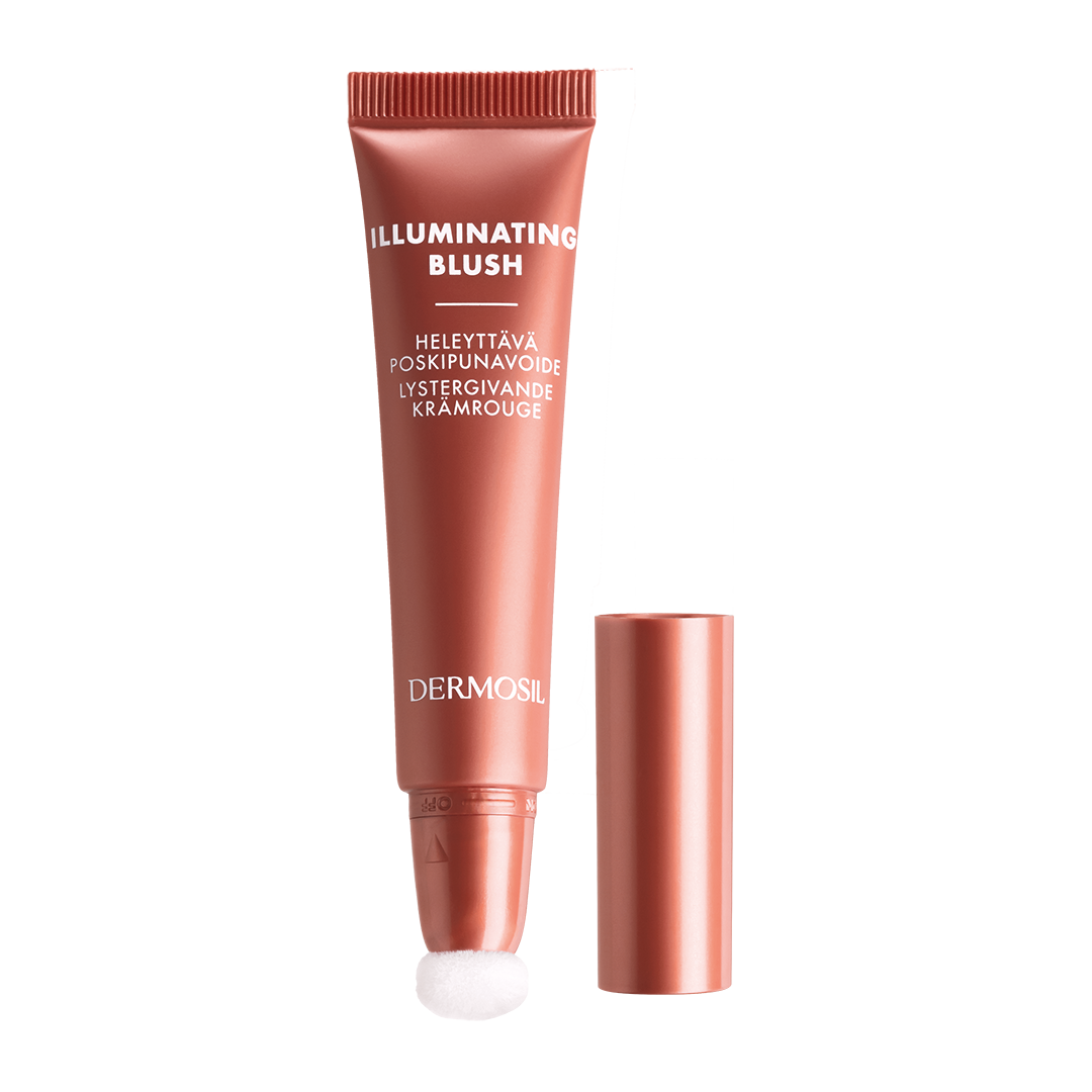 Diskret pärlemorskimrande persikotonad krämrouge—lätt att applicera med applikator, passar särskilt för torr hud.