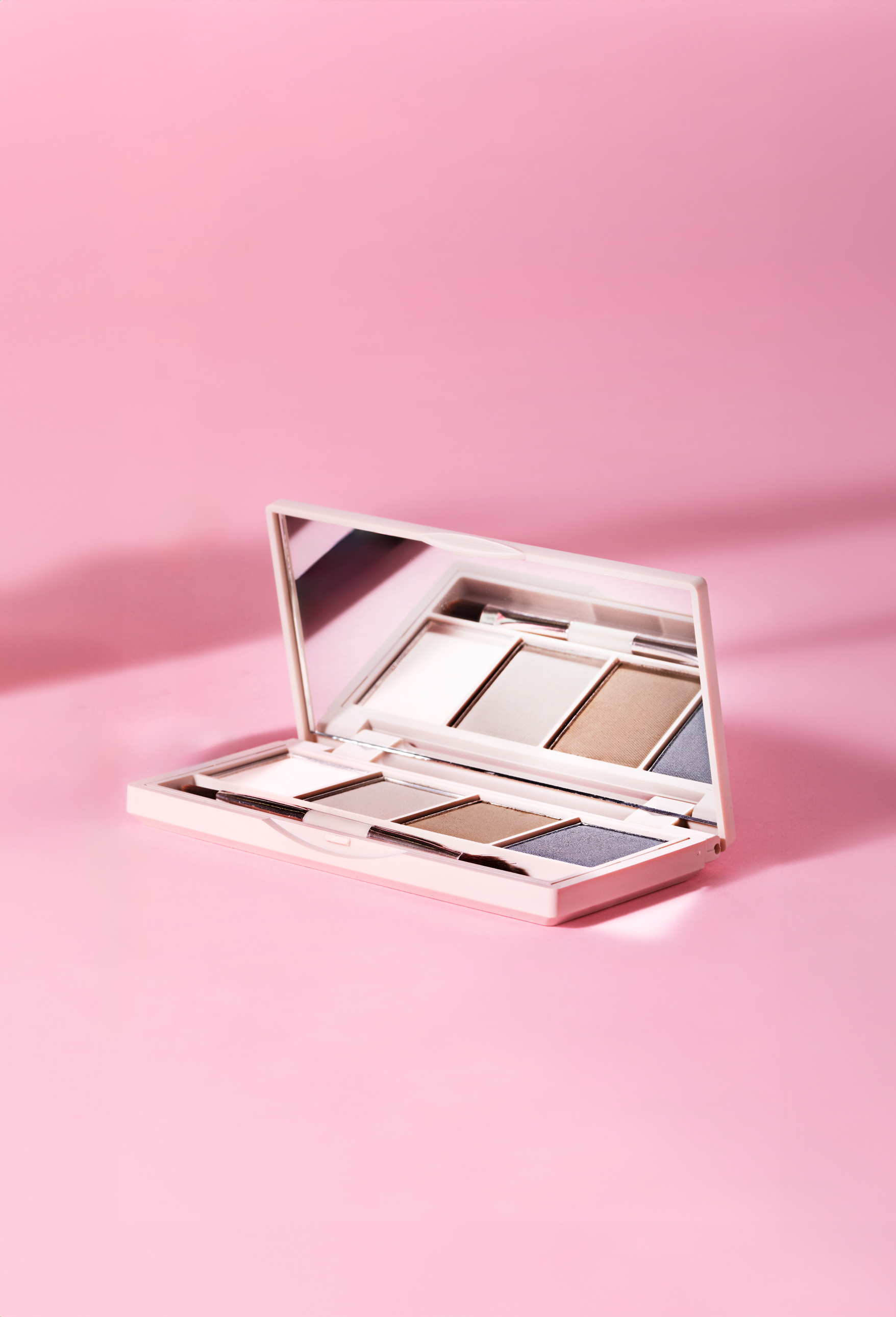 I asken finns en spegel och en liten applikator. I applikatorns ena ände finns en ögonskuggspensel med sned spets och i den andra en oval pensel. Penslarna är tillverkade av syntethår.
